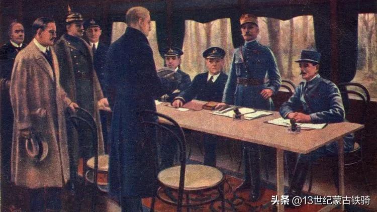 1918年11月8日,马塞厄斯·埃尔茨贝格尔率领德国代表来到法国巴黎贡比涅森林与协约国代表进行谈判。他们接受协约国提出的投降条件:德国须交出重炮和飞机、5000辆卡车、5000辆火车头和15万节车厢,大型军舰和大多数潜水艇要停泊在各协港口;驻扎在奥匈帝国、罗马尼亚、土耳其和俄国的德国军队必须立即撤出;莱茵河西部领土上的军队必须撤走。埃尔茨贝格尔和他的同胞们同意这些条件。停战协定是在福煦的铁路专车里签订的。