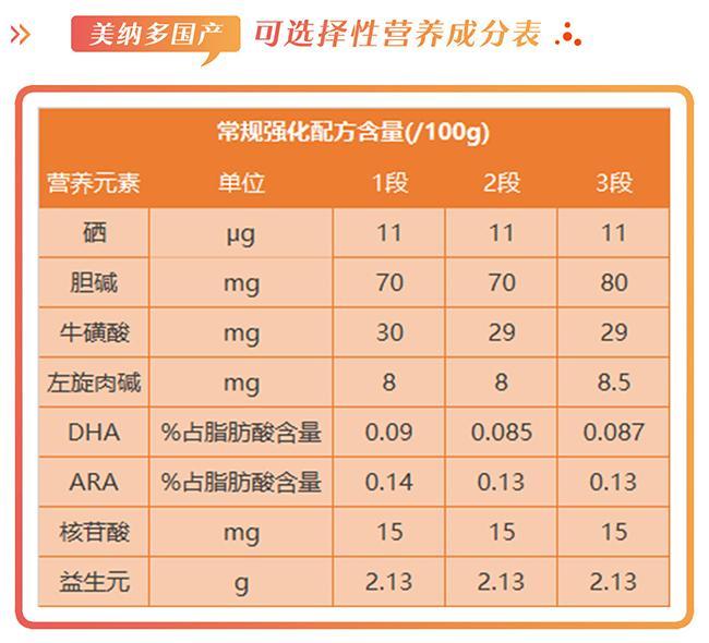 在营养与配方上,美纳多奶粉添加的基础营养配方严格遵守国家标准,小编在此就不多说,我们具体谈谈大家比较关心的可选择成分。美纳多奶粉全段添加8个可选择成分,均为常规强化配方。