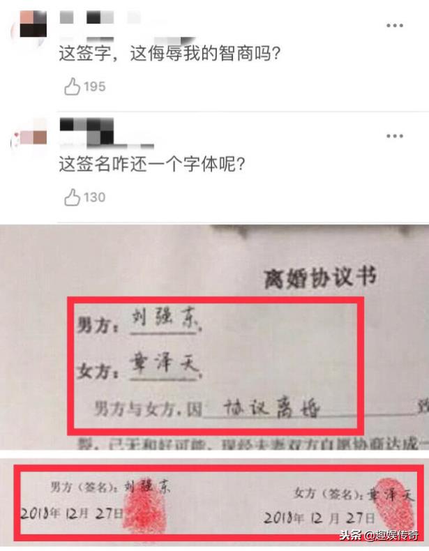 并且除了这点之外,还有细心的网友发现,这份爆料的离婚协议书上的字体很是可疑,认真观察的话可以明显的看出“章泽天”和“刘强东”的签名字迹是同一个人所为,并且签字日期的数字也是一模一样,由此可见,这份协议书并不是真实的,没有什么可信度。