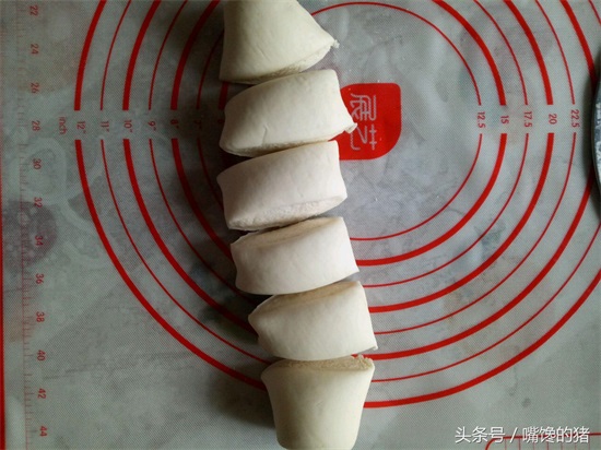 3.揉成长条状,用刮板切开,均分成六等份