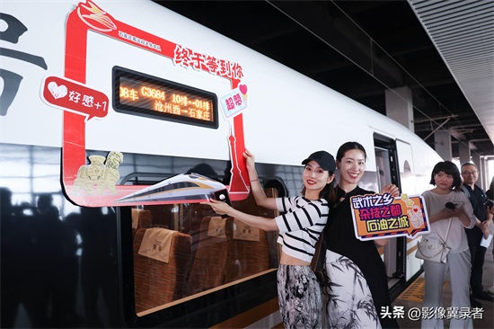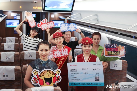 乘务员与旅客在石家庄站庆祝沧州西至石家庄G3681/4次高铁列车首发开行。