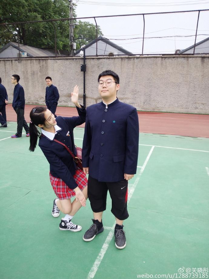 这张照片最有看点,关晓彤与同伴男同学合影,故意屈膝让自己变矮,照顾旁边个子矮的男生,真是好贴心——