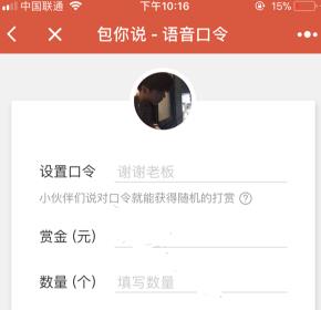 2、然后在该小程序界面需要属于口令,收到这个语音红包的人需要使用语音说出这个口令即可领取红包哦,输入赏金和数量,点击【生成语音口令】,如图所示。