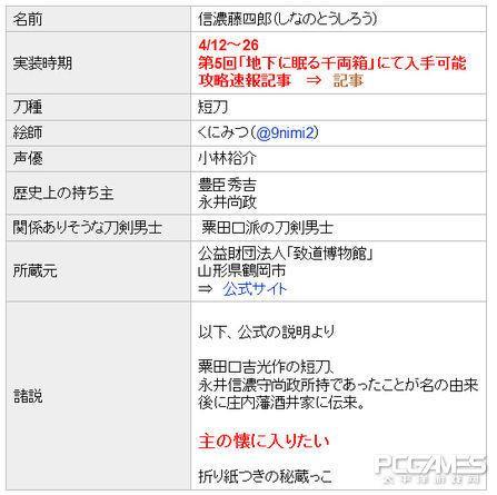 《刀剑乱舞-ONINE-》从2016年4月12日起,正式开始举行期间限定活动“地下に眠る千両箱”。在这次活动中能够入手到的新刀剑男士为“信浓藤四郎”。这个系列的活动目前为止出的新刀剑男士均为粟田口刀派的短刀,这次又是怎样的一位正太呢!