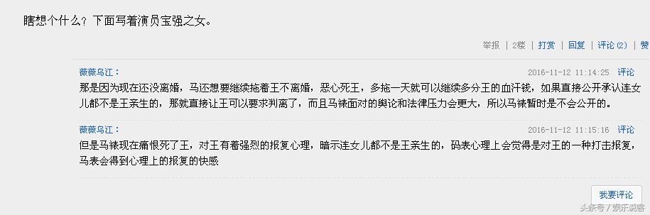 薇薇乌江:那是因为现在还没离婚,马还想要继续拖着王不离婚,恶心死王,多拖一天就可以继续多分王的血汗钱,如果直接公开承认连女儿都不是王亲生的,那就直接让王可以要求判离了,而且马面对的舆论和法律压力会更大,所以马暂时是不会公开的。