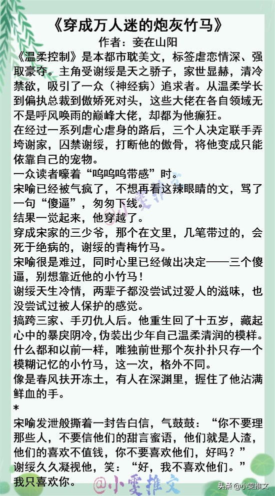 作品简介:宋喻看了一本小说,叫《温柔控制》,里面的主角谢绥身世悲惨,孤苦伶仃,从小活在流言蜚语中,遇到的也都是人渣,饱受欺凌和欺骗,气的他边看边喝空一瓶水。一朝穿书,成为故事里谢绥只出场过几次的小竹马,宋喻心情复杂,决定守护他陪伴他,远离人渣。本文轻松无虐,讲述主角们校园的生活和成长,兼带打脸渣渣,是一篇温暖治愈欢脱的校园文。