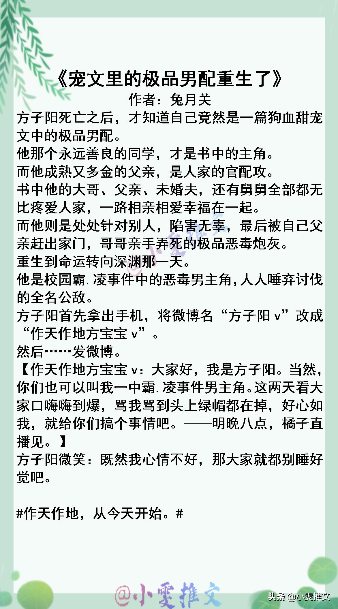 作品简评:方子阳死亡之后,才知道自己竟然是一篇狗血甜宠文中的男配。在书中,他是个处处针对主角,无恶不作,最终被自己亲人大义灭亲的恶毒炮灰。可是只有方子阳自己清楚,那些所谓的罪名不过都是有心之人的算计,不过都是欲加之罪何患无辞。当生命再次来过,他回到命运转折走向深渊的那天。方子阳决定,这一辈子,他再也不会傻傻的相信任何人,当别人的傀儡摆布。他要努力掌握自己的命运,将前世失去的东西和遗憾,全部都找回来。无论前途如何黑暗,都要做自己命运的主宰。本文行文流畅,情感细腻,剧情跌宕起伏,爽文节奏把握十分恰当。将主角重生的冲突和感情刻画得非常突出,通篇代入感极强。角色形象丰满,冲突剧情过渡流畅,是一篇引人入胜、值得一读的佳作。