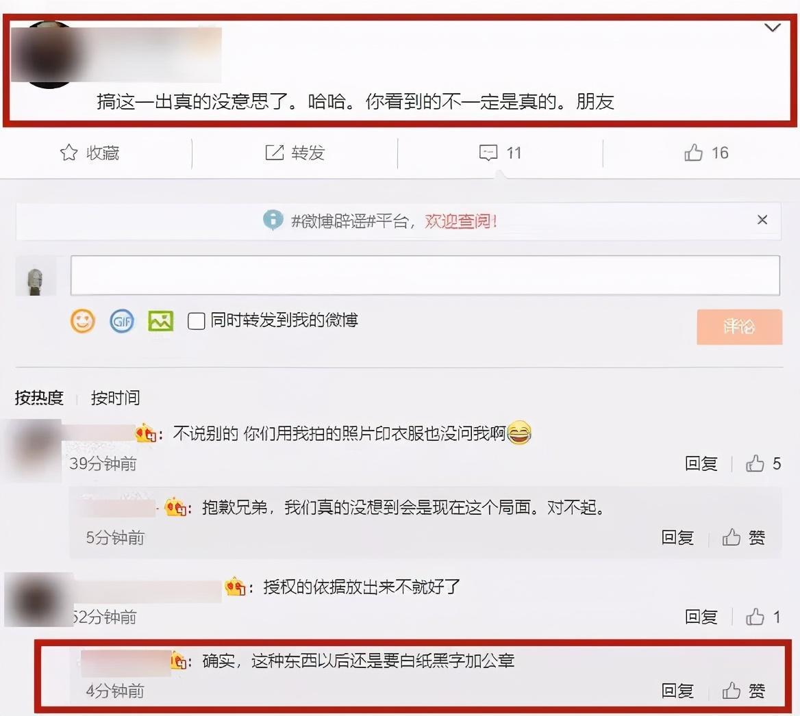 微博大V发放这份声明之后,国潮品牌的主理人也在微博上打起了哑谜,发了一条:“搞这一出真的没意思了。哈哈。你看到的不一定是真的。朋友”