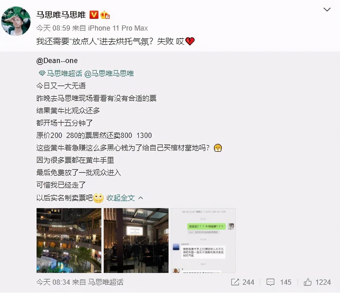 在这名粉丝的微博中,简单阐述了上海站”黄牛”比观众多、票价贵的情况,并且还说最后免费放了一批观众进入。马思唯本人也回应了这条微博。