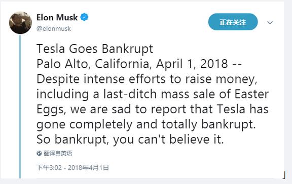 4月1日,特斯拉CEO马斯克在社交媒体上"郑重其事"地宣布特斯拉"破产"。