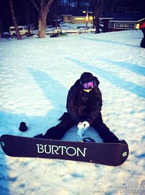 昆凌在微博写道:“今年第一次尝试雪板,没想到大腿比我先放弃了。”