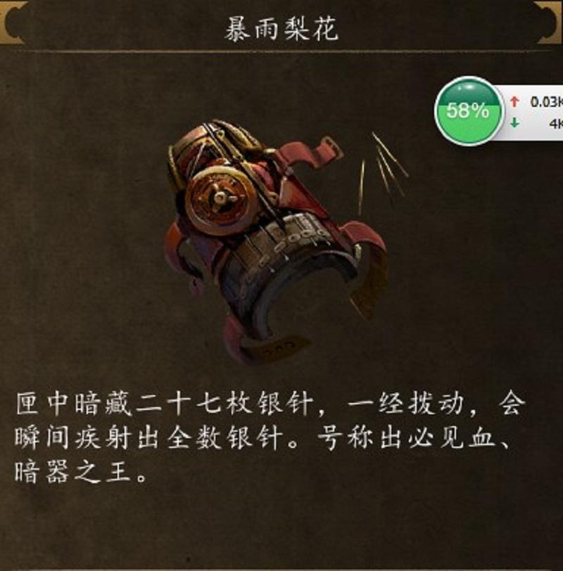 介绍:可以连续发射二十七枚梨花针,威力巨大。但要用深海沉银的银母制作。
