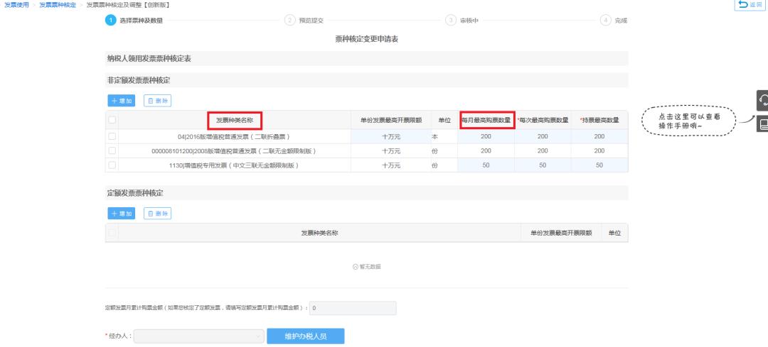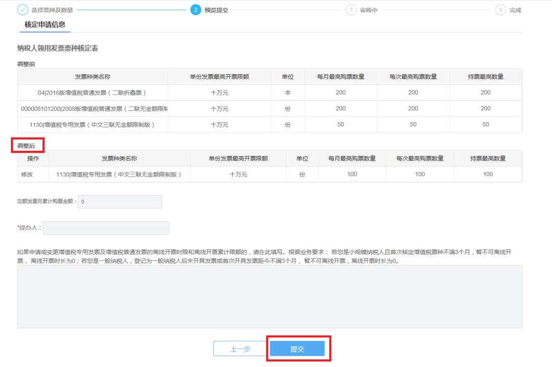 验证通过后,纳税人可根据开票需求,变更需核定票种的购票数量。完成后点击下一步。