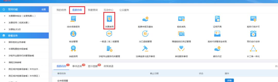 登录电子税务局,在首页选择“我要办税”—“发票使用”。