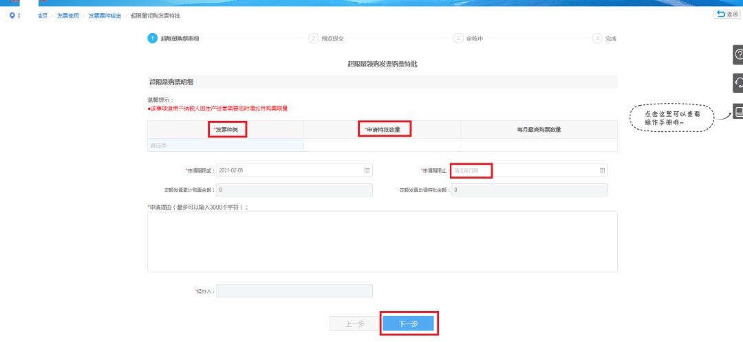选择需要增量的发票种类,并键入需要申请的发票数量。填写完成后点击下一步。