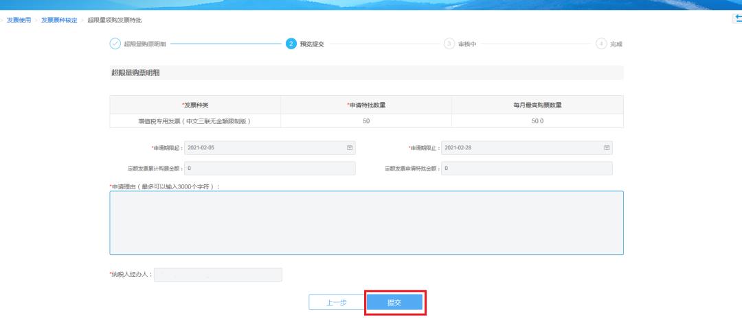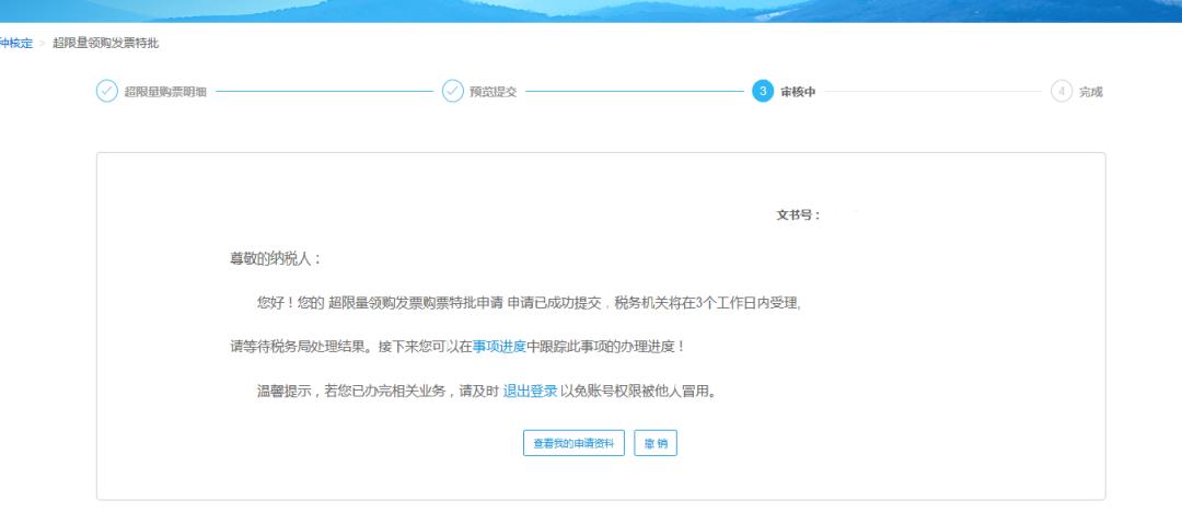 出现此页面时说明超限量领购发票特批申请已提交完成。
