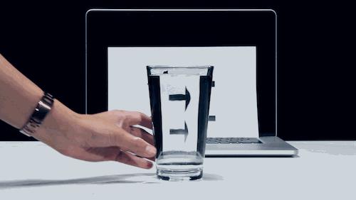 方法:只要将装满水的玻璃杯,放到箭头与视线的中央,就会成功翻转箭头了!