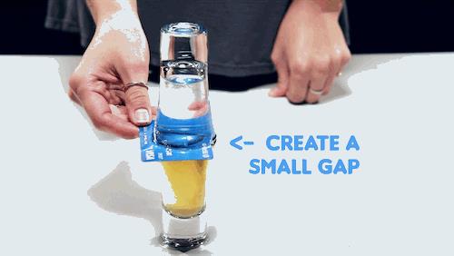 原理:因为水的密度比威士忌还要大,所以会藉由小缝往下沉。威士忌被挤压就会跑到上面的杯子去了,有空拿这个变魔术,吓吓小朋友吧。