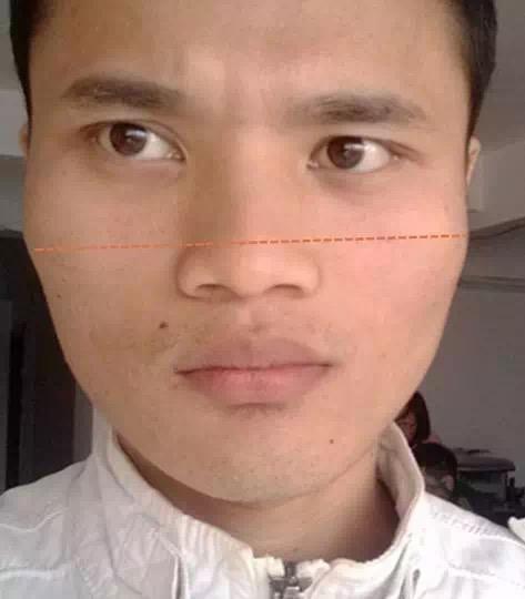 右图,三条橙色的直线,眉骨颧骨的连线都是笔直的一条。只有下颌骨是倾斜的,左右下颌骨对不上。且连接鼻尖,嘴,下巴尖的中心线偏移。这些问题表现在脸上,就是左图这样。