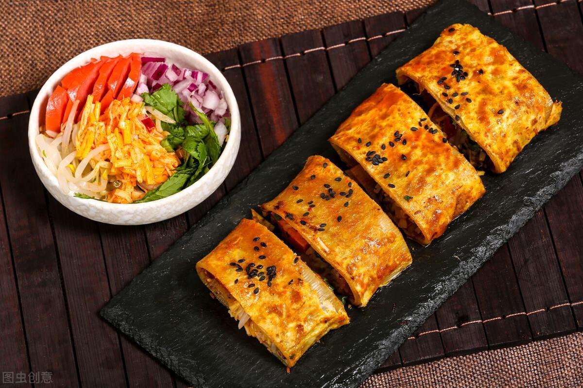 4.翻面之后加入糖和醋各适量,刷上酱,撒上香菜和洋葱,放入烤肠,然后把冷面卷起来。