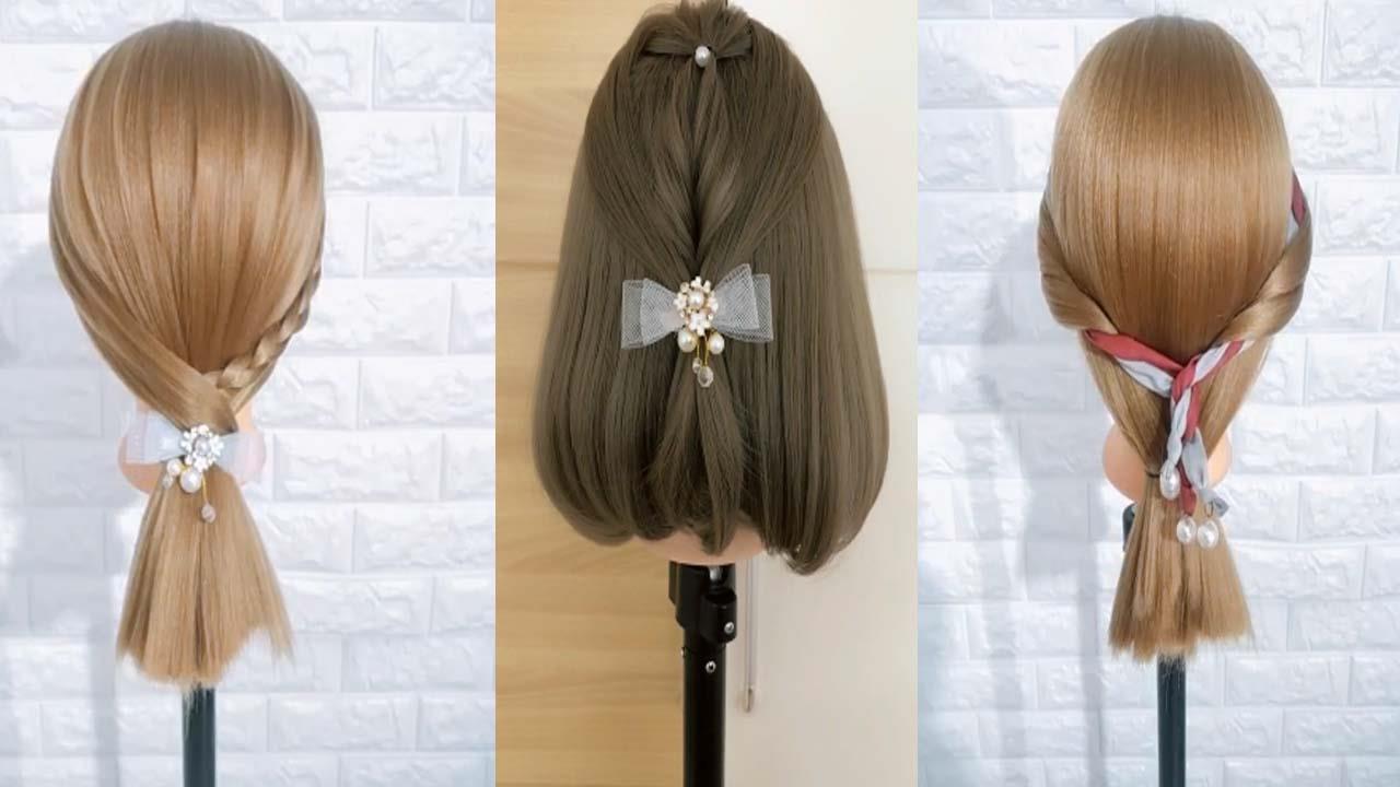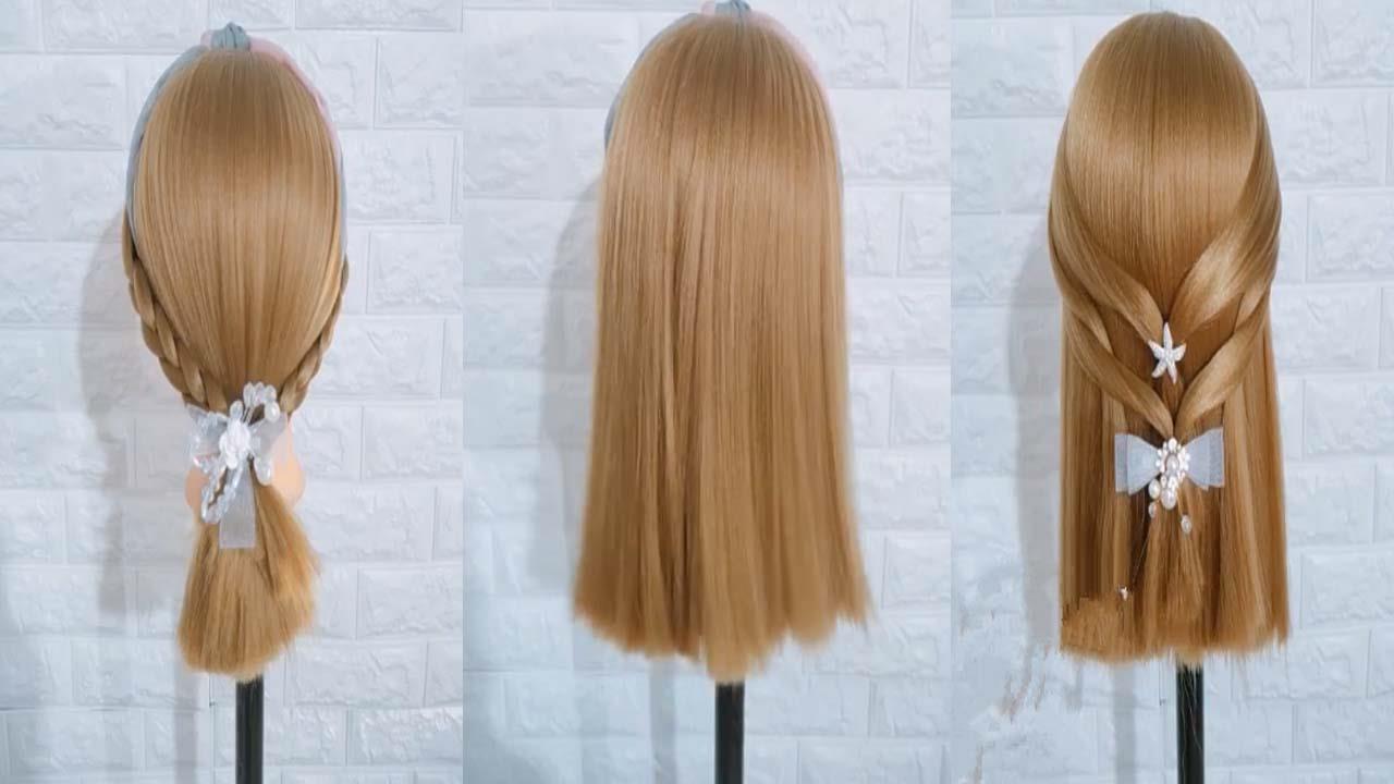 第一款:首先借助发箍的辅助将头发分为三股,前区两侧梳理两个辫子,后区绑一个小马尾,然后将三股发扎在一起,放上饰品,完成!