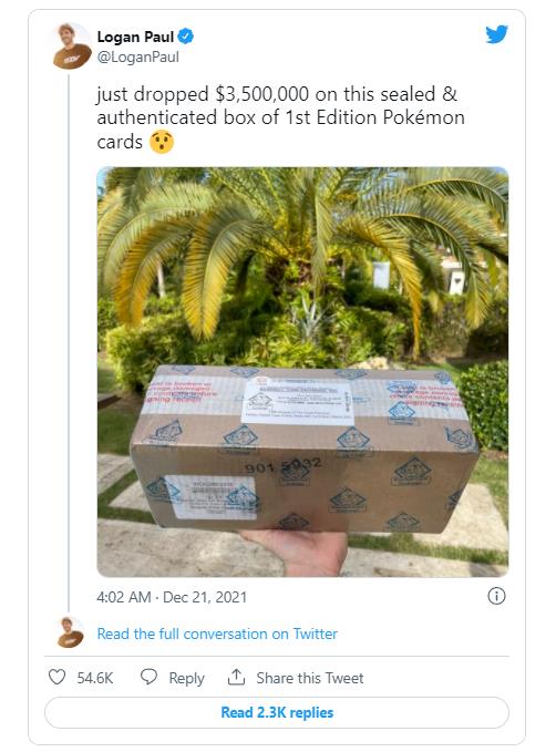 据CNET报道,Logan Paul经常花巨额资金购买宝可梦卡牌。他曾经花了数百万美元购买稀有卡牌,在去年6月,他甚至把一张价值15万美元的Charizard卡挂在脖子上进入拳击场。而在12月,这位YouTube网红花了350万美元购买一盒密封的所谓第一版基本套装宝可梦卡牌。