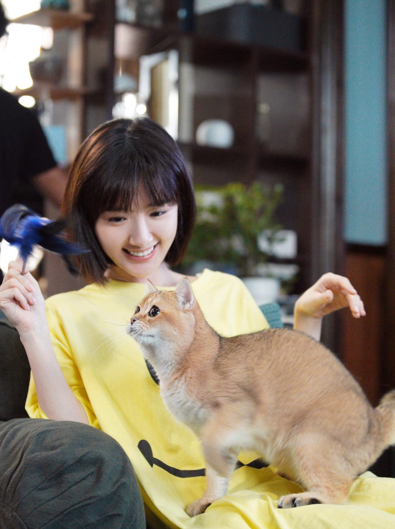 在该剧曝出的两张剧照中,毛晓彤穿着一件黄色的短袖T恤裙,右手拿着逗猫棒,正在与怀里的猫咪嬉戏打闹着。弯弯的眉眼配上温柔的笑意,显现了钟晓芹居家贤惠的一面。
