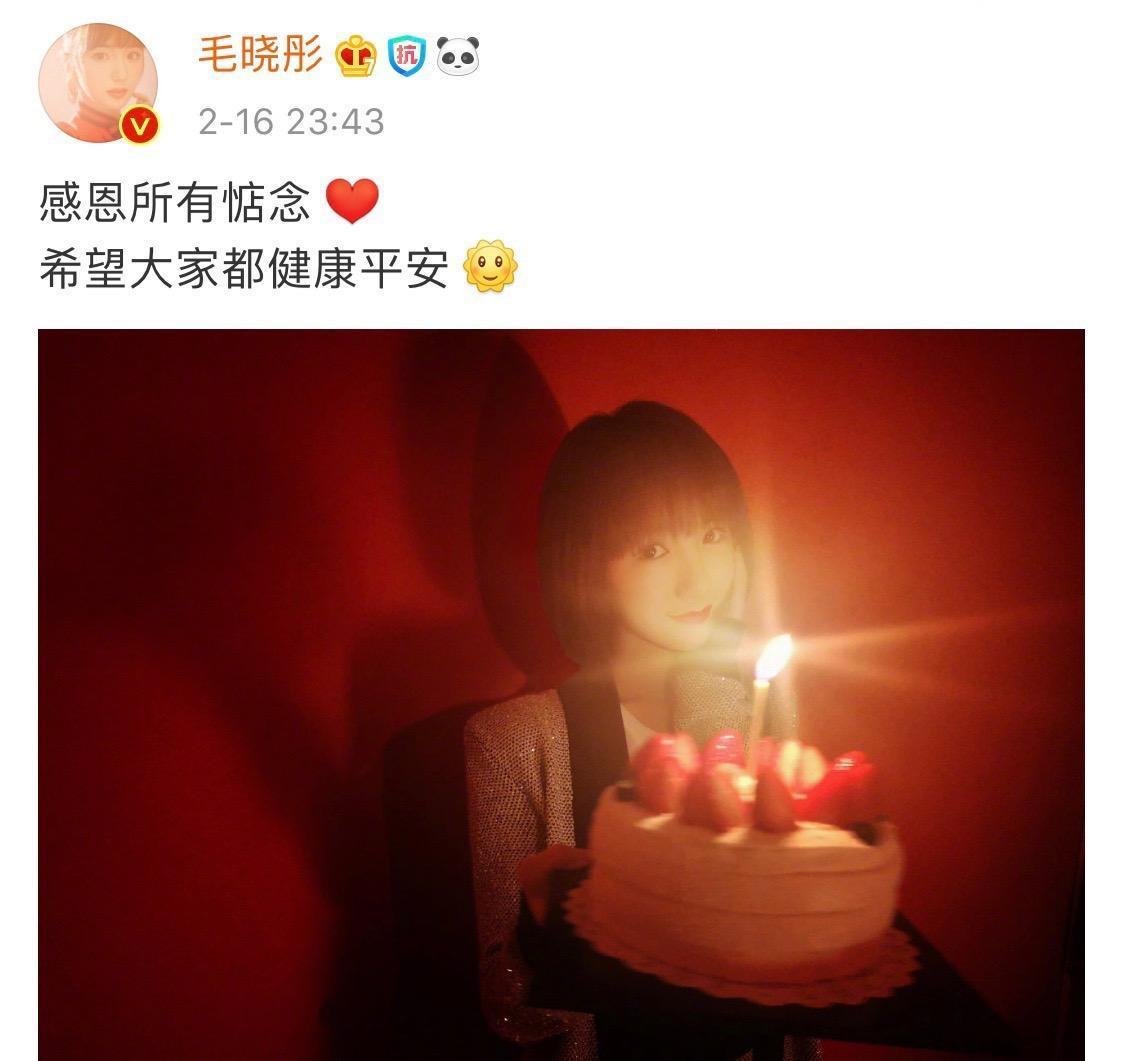 2月16日晚,毛晓彤在微博晒出照片庆生并配文:“感恩所有惦念,希望大家都健康平安。”