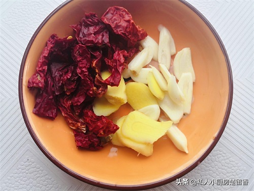 干椒切短,姜蒜切成片。配料越简单,这菜越原滋原味,清淡的菜肴不需要放过多的调料。