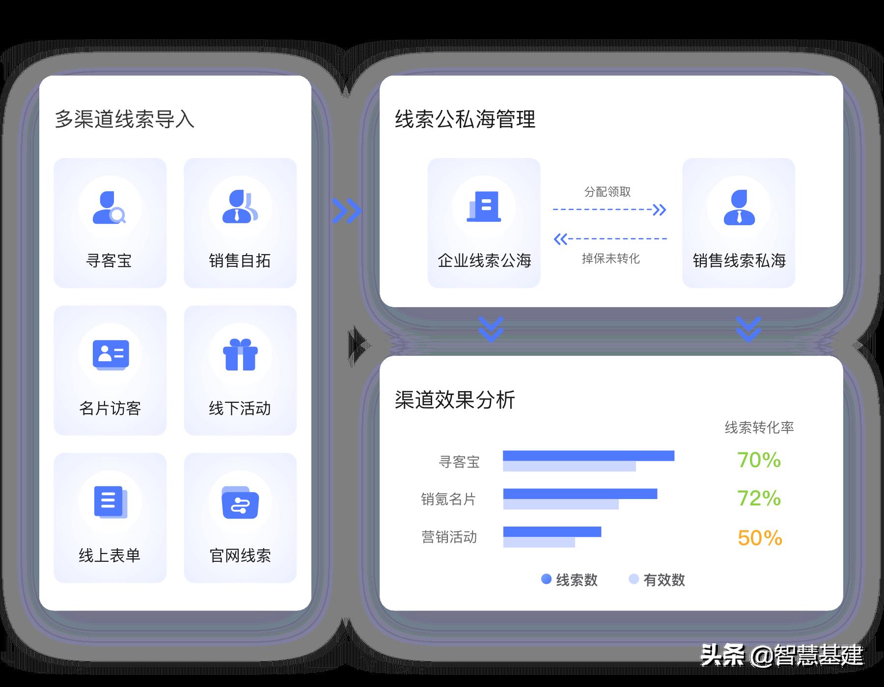 多渠道线索统一管理聚合寻客宝、名片、官网注册、市场推广、销售自拓等多渠道线索,实现对线索的统一管理自定义线索流转规则自定义线索分配、领取、掉包、去重规则,提升线索使用率、降低撞单概率各渠道效果对比分析线索来源一键打标,洞察不同渠道转化成单效果,助力企业不断优化获客渠道