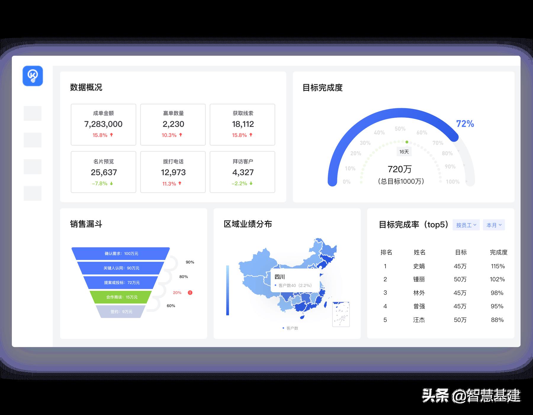 业绩目标数据业绩进度可视化动态呈现,实时掌握业绩进度目标分解、任务分发,保证销售业绩最终达成销售排行数据团队与个人销售数据实时更新,排名激发竞争潜能对比分析多维度筛选,全面洞察销售能力人员行为数据销售日常工作行为报表化展现,员工管理有据可依行为数据智能分析,定向优化团队工作效能