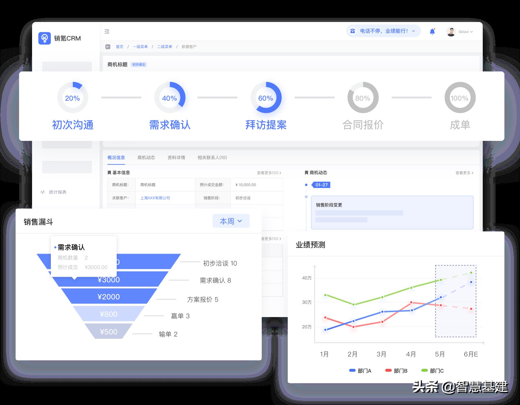 商机推进阶段从线索到成单的全流程推进记录,以规范化管理加速商机转化销售漏斗分析全局客户漏斗分析,可视化所有商机状态分布,洞悉问题环节销售业绩预测智能预测销售业绩,帮助管理者进行科学决策