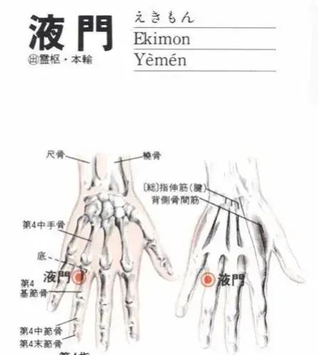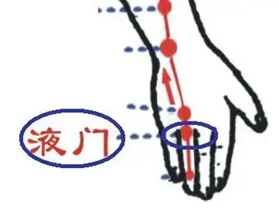 我们先简单回顾一下液门穴。液门是手少阳三焦经的荥穴,其五行属水。可以说液门穴的名字就已经告诉你它的价值。液就是水液之意,而门指的是门户。因为液门穴是三焦经的荥穴,也就是调节三焦经水液的门户穴位,所以古人把穴位称之为液门穴。也正因如此,液门穴擅长治水,也能增液。液门穴的定位是相对简单的,它就位于我们人体的手上。教材《针灸学》记载:“液门穴在手背部,当第4、5指间,指蹼缘后方赤白肉际处。”如果你还是找不到穴位,那它还有一个非常简便的取穴方法,你在手背部第4、第5指指缝间掌指关节前可触及一凹陷处就是液门穴了。