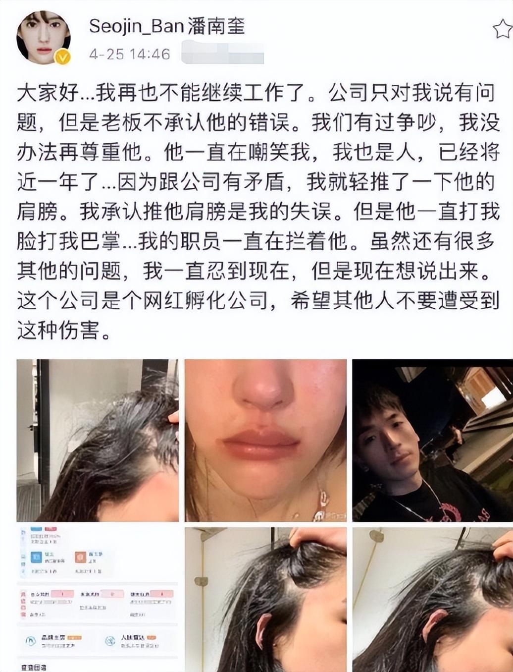 而潘南奎自己搞出一大堆事情不说,还经常在公司发脾气,砸坏公用设备。至于她自称“轻轻推搡老板”后被暴打,也完全不是那么一回事,反而是老板经常被潘南奎攻击,忍无可忍才终于还手。