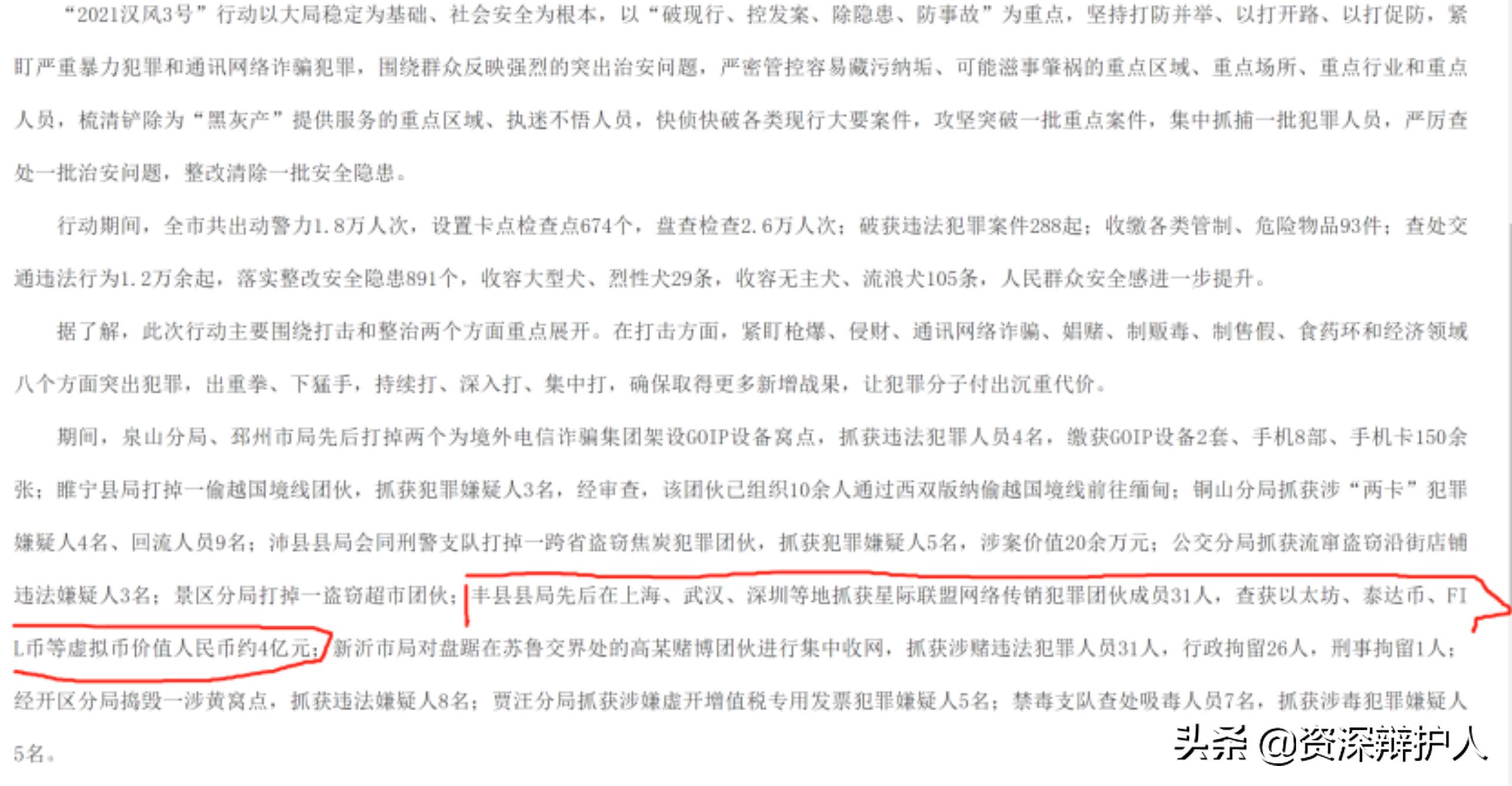 其中,丰县县局先后在上海、武汉、深圳等地抓获星际联盟网络(IPFS)传销犯罪团伙成员31人,查获以太坊、泰达币、FIL币等约4亿元的虚拟币。