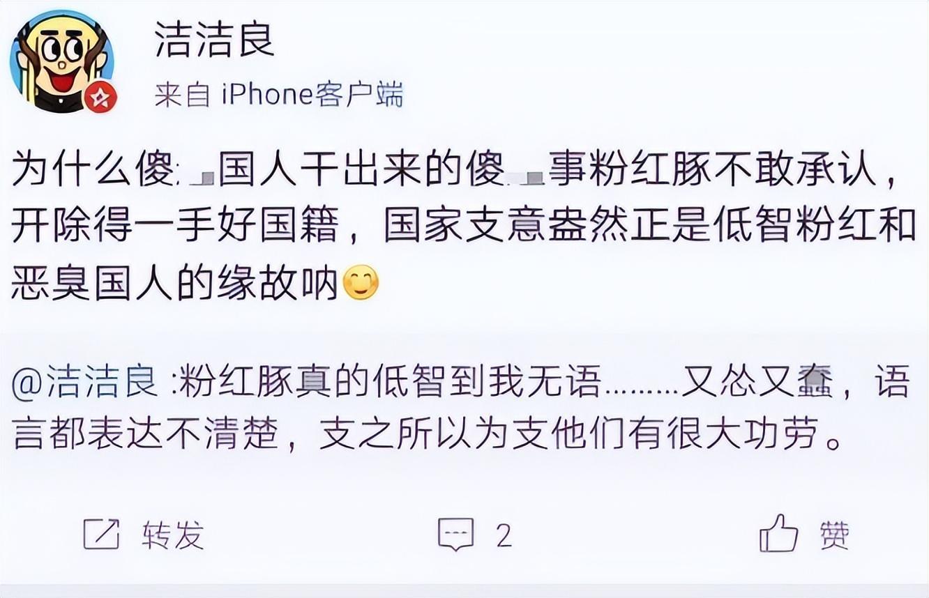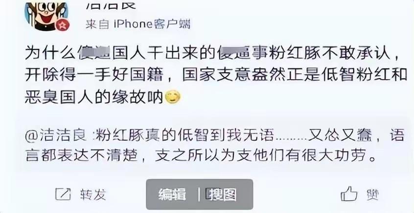 要知道,所谓的“粉红豚”是当年日本人用来侮辱中国的爱国青年的词汇,所以“洁洁良”使用这样的词,不就是在侮辱国人吗?