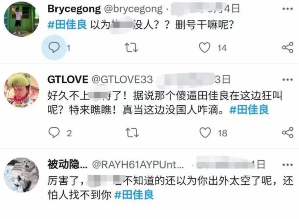当时的田佳良已经不再遮掩自己的身份,实名在网上辱骂国人。