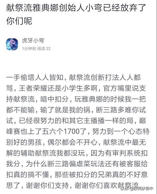 这是有一段雅典娜献祭流的巅峰时期,本来玩家一开始都说反对献祭流,因为非常影响游戏体验, 输赢全看对面傻不傻,结果天美出来后,发公告禁止雅典娜献祭流,舆论马上走向官方自己瞎改设定,还限制玩家打法,后面天美认怂了,公开道歉,承诺重做或改动雅典娜,并在这一段时间里举报机制无视了各种0-20的雅典娜。