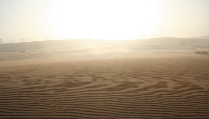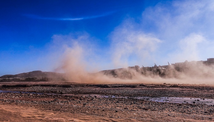 刮黑风时,靠近地面的空气很不稳定,下面受热的空气向上升,周围的空气流过来补充,以至于空气携带大量沙尘上下翻滚不息,形成无数大小不一的沙尘团在空中交汇冲腾。