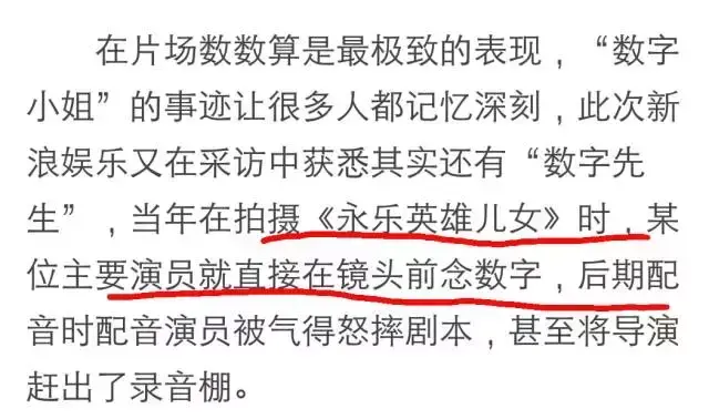 采访揭晓了“数字先生”的存在,其中有一段说当年在拍摄《永乐英雄儿女》,某位主要演员在镜头面前念数字,后期配音时配音演员被气的怒摔剧本,甚至将导演赶出录音棚.......