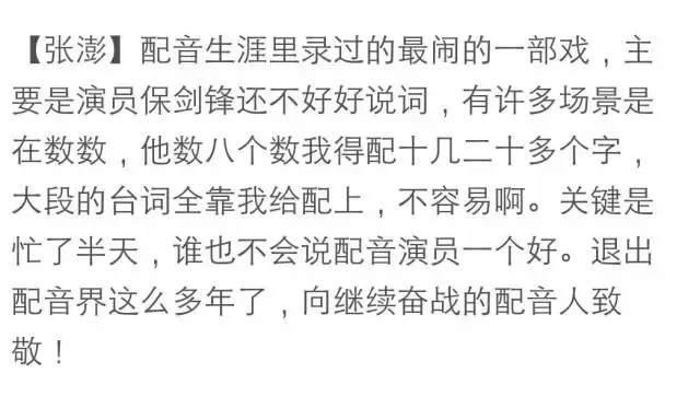 张澎前几年在采访中曾公开说:发誓不再为保剑锋配音,就是因为这个艺人不好好说台词!