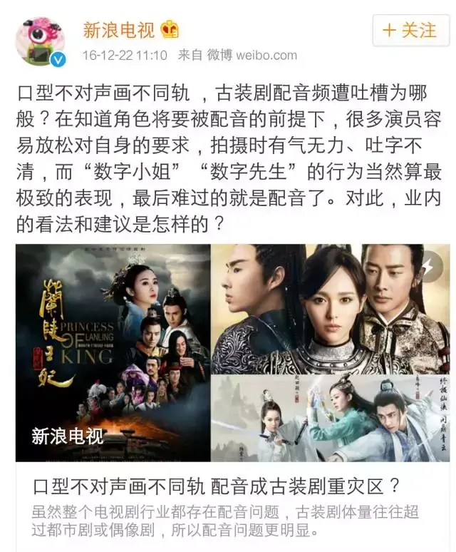 上个月新浪娱乐采访了著名配音演员张澎,边江等,剖析古装剧配音口型不对声画不同轨被吐槽的原因,