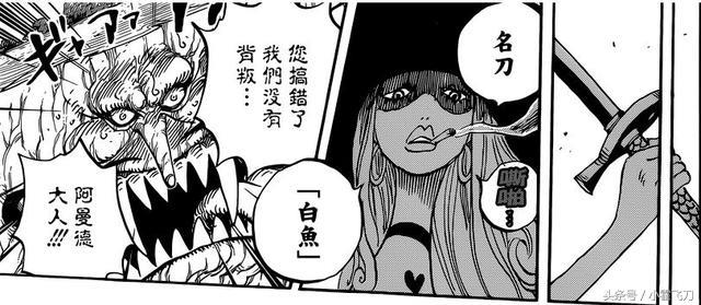 5,白鱼,四皇bigmom海贼团战斗员阿曼德,绰号鬼夫人的佩刀,头戴一顶巨大女式花帽,眼神凌厉的蛇首族女性,在其他人对付路飞和娜美时,阿曼德抽出名刀白鱼并对“背叛者”巴姆大王进行惩罚。