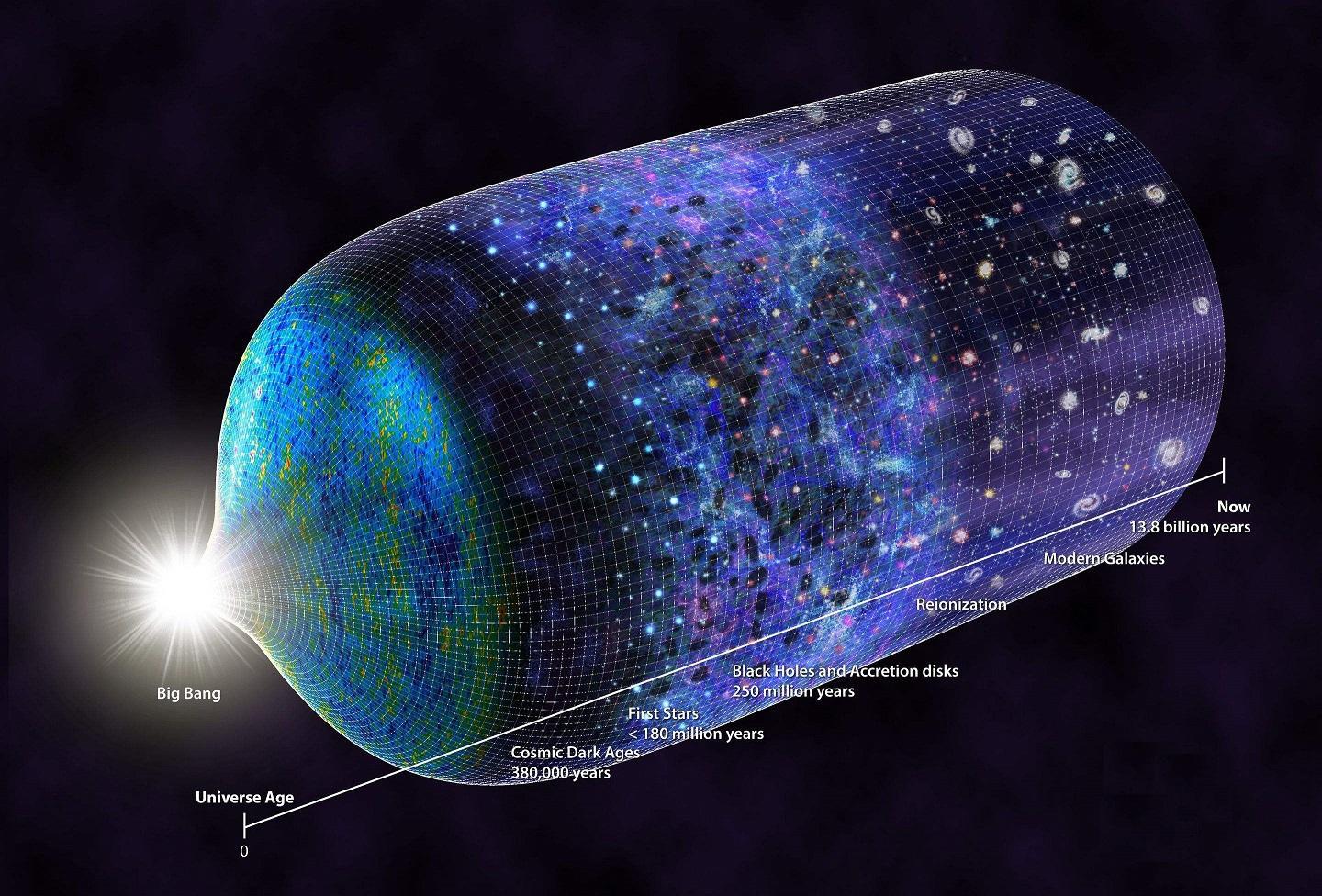 七个世纪后,在1949年BBC电台的一次演讲中,天文学家弗雷德·霍伊尔提到了当时主要由乔治·加莫倡导和发展的假说,即“宇宙中的所有物质都是在遥远过去某个特定时间的一次大爆炸中产生的”这一术语代表当今流行的宇宙学模型:138亿年前,一个奇点在高密度和高温下突然快速膨胀——根据最近的数据,这个数据得到了修正,随后的冷却首先允许亚原子粒子的形成,然后是原子的形成。