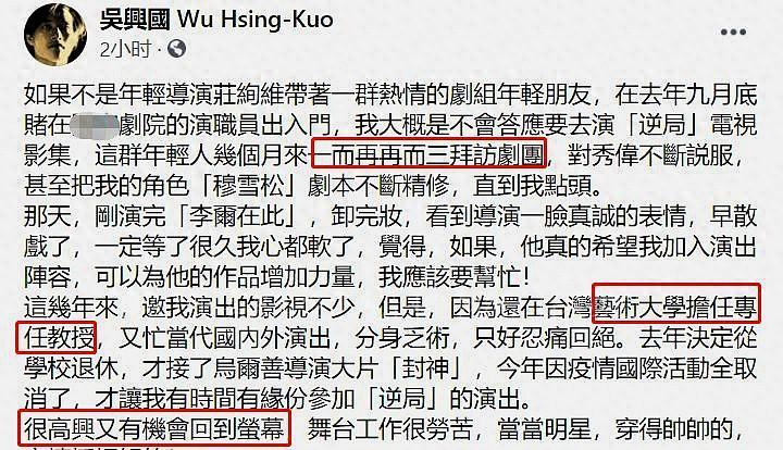 吴兴国近年来淡出了娱乐圈,上一部戏《爱在廊桥》已经是九年前的事情。然而,不少剧组都曾试图邀请他复出,但每次都遭到他的拒绝。《逆局》的剧组在前两次被拒绝后,并没有放弃,第三次终于打动了这位老戏骨。