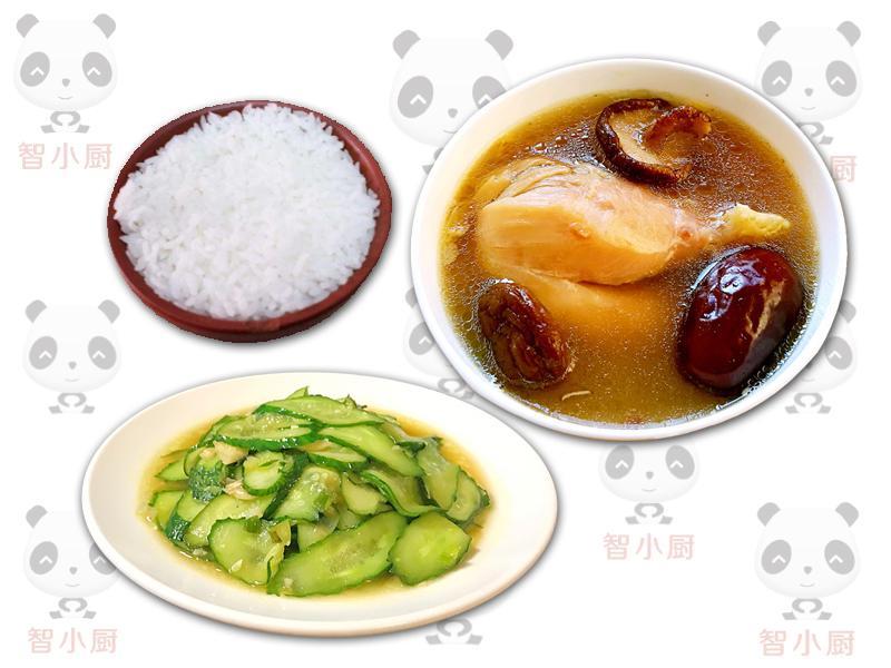 米饭一碗+清炒黄瓜一份+香菇大枣炖鸡一份