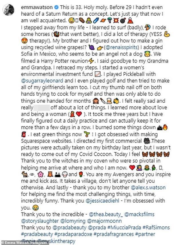 《哈利·波特》系列电影中的女主角艾玛·沃特森(Emma Watson)近日在社交媒体上发帖,庆祝自己33岁生日,并分享了她对于“土星回归”(Saturn Return)的见解。