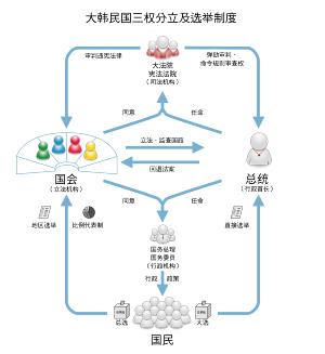 韩国的行政部门实行总统制,是韩国三权分立制度的核心体制。大韩民国总统由韩国国民直接选举产生,任期为5年。为避免任何个人长期掌握国家权力,大韩民国宪法规定总统不能连任。韩国总统通过由15-30人组成的国务会议行使行政权。