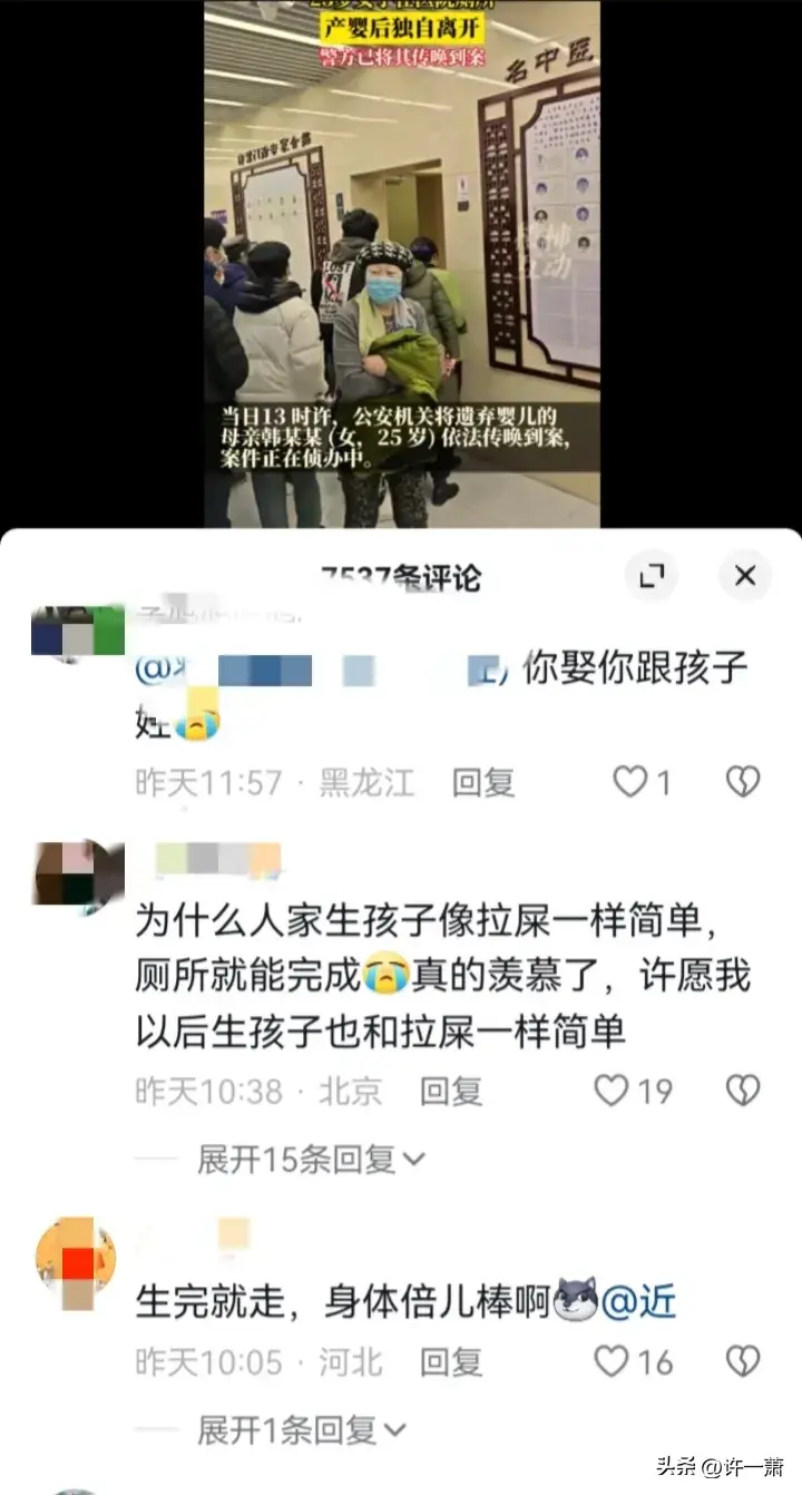 有个北京的女网友说话更是犀利,她说人家生孩子为什么就像是拉屎一样简单,在厕所都能完成,她希望自己以后生孩子也能像这个25岁的女的一样简单,她就谢天谢地了。