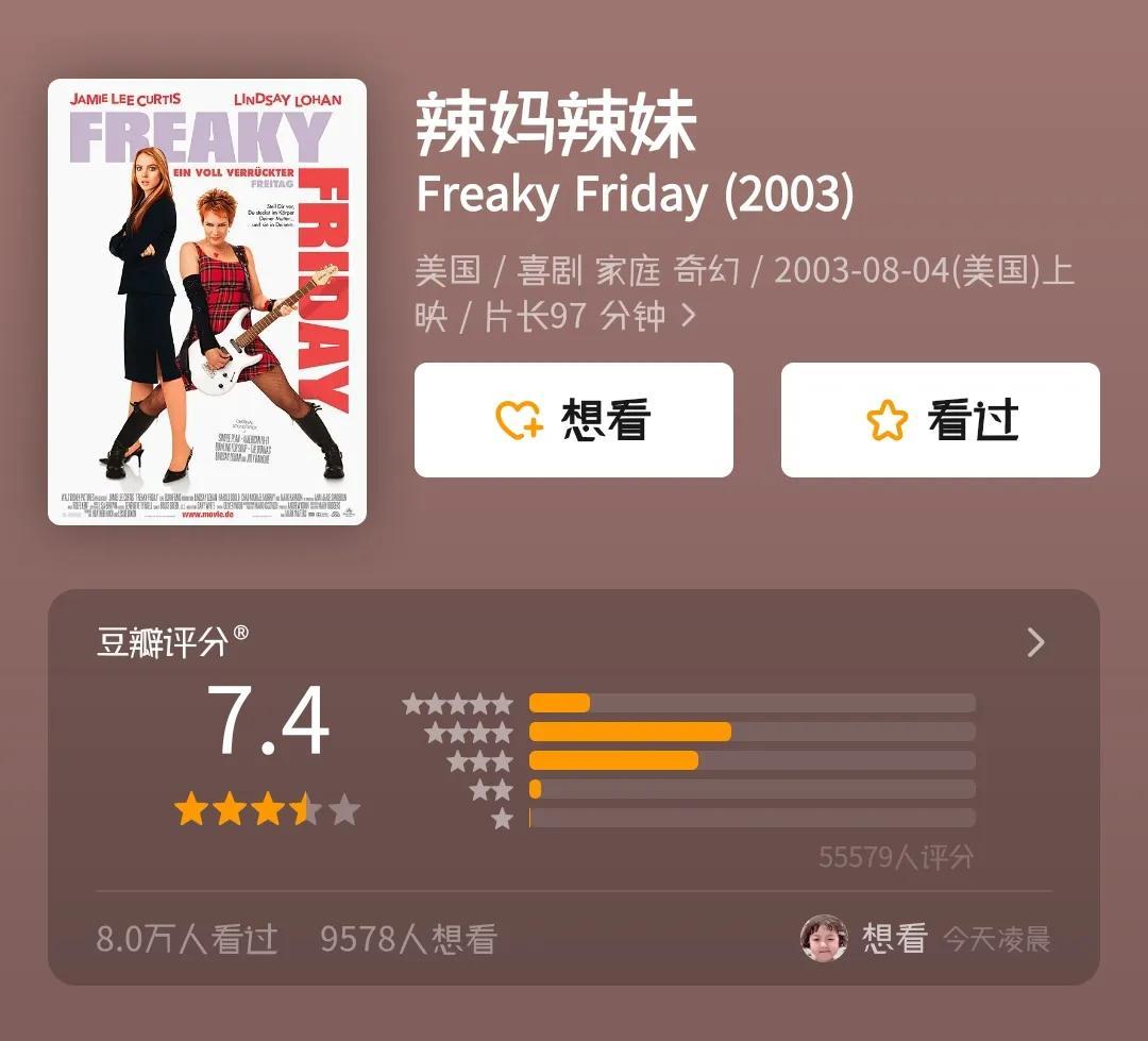 灵魂交换的故事用现在的眼光来看很老套,但在快二十年前,这部电影还算得上新颖。母女俩互换角色后外形与行为形成的强烈反差给影片带来了极大的喜剧效果。两人要赶在周六母亲再婚前变回原来的角色,又给影片增加了紧张感和戏剧性。虽然现实中我们无法和母亲互换灵魂来理解彼此,但换位思考和互相体恤包容还是很有必要。